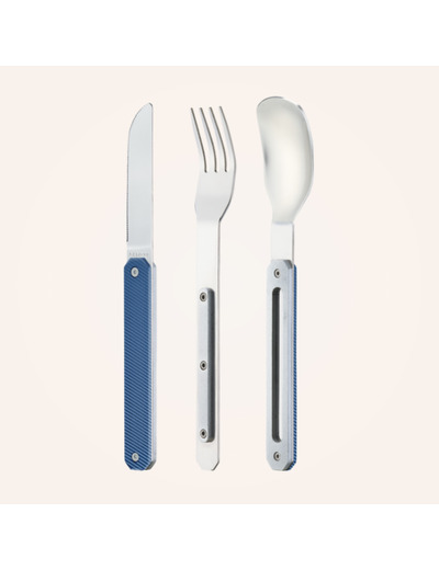 Couverts en acier inoxydable martensitique 2CR14, finition poli miroir. Composé d’une grande cuillère, d’une fourchette 4 dents et d’un couteau à lame micro dentée. Manche aluminium. Assemblage aimanté. Livré avec étui de transport en polypropylène rigide (PP). Compatible lave-vaisselle.