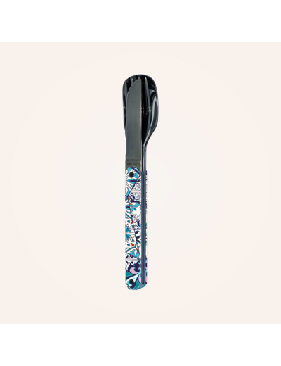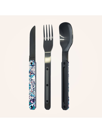 Couverts en acier inoxydable martensitique 2CR14, finition poli miroir noir. Composé d’une grande cuillère, d’une fourchette 4 dents et d’un couteau à lame micro dentée. Manche en polymère (PC) transparent décoré. Assemblage aimanté. Livré avec étui de transport en polypropylène rigide (PP). Compatible lave-vaisselle.