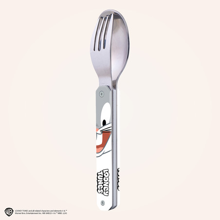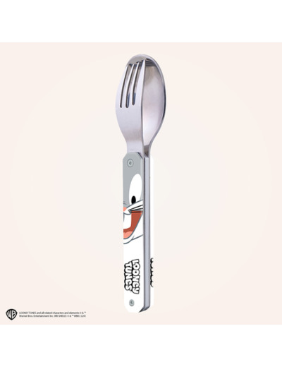 Couverts en acier inoxydable martensitique 2CR14,  finition poli miroir. Composé d’une cuillère et d’une fourchette 4 dents. Manche en polymère (PC) transparent décoré. Assemblage aimanté. Livré avec étui de transport en polypropylène rigide (PP). Compatible lave-vaisselle.
