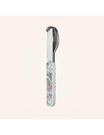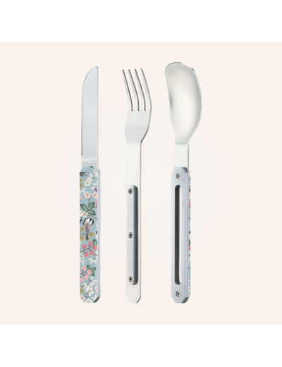 Couverts en acier inoxydable martensitique 2CR14, finition poli miroir. Composé d’une grande cuillère, d’une fourchette 4 dents et d’un couteau à lame micro dentée. Manche en polymère (PC) transparent décoré. Assemblage aimanté. Livré avec étui de transport en polypropylène rigide (PP). Compatible lave-vaisselle.