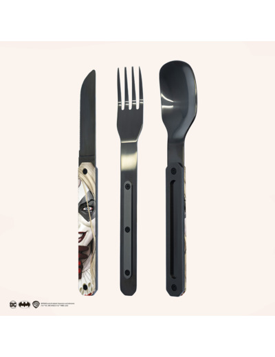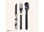 Couverts en acier inoxydable martensitique 2CR14, finition poli miroir noir. Composé d’une grande cuillère, d’une fourchette 4 dents et d’un couteau à lame micro dentée. Manche en polymère (PC) transparent décoré. Assemblage aimanté. Livré avec étui de transport en polypropylène rigide (PP). Compatible lave-vaisselle.