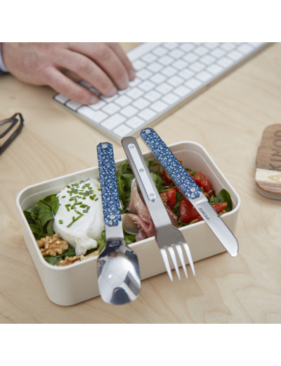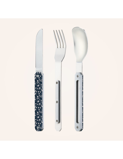 Couverts en acier inoxydable martensitique 2CR14, finition poli miroir noir. Composé d’une grande cuillère, d’une fourchette 4 dents et d’un couteau à lame micro dentée. Manche en polymère (PC) transparent décoré. Assemblage aimanté. Livré avec étui de transport en polypropylène rigide (PP). Compatible lave-vaisselle.