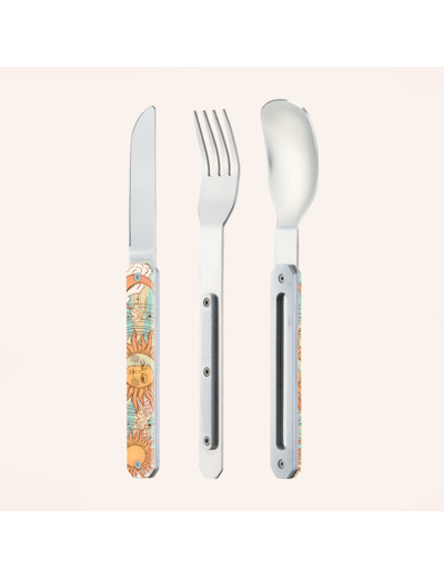 • Comprend : un couteau à lame micro-dentée, une fourchette à 4 dents, une grande cuillère et un petit pochon pour ranger les couverts