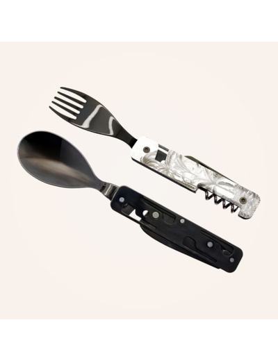 Couverts multifonctions en acier inoxydable martensitique 2CR14, finition noire brillante. Composé d’une grande cuillère, d’une fourchette 5 dents, d’un couteau à lame micro dentée, d’un tire-bouchon 4 spirales, d’un outre boîte et d’un décapsuleur. Manche en polymère (PC) transparent décoré. Assemblage aimanté. Livré avec étui de transport en polypropylène rigide (PP).