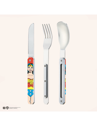 Couverts en acier inoxydable martensitique 2CR14, finition poli miroir. Composé d’une grande cuillère, d’une fourchette 4 dents et d’un couteau à lame micro dentée. Manche en polymère (PC) transparent décoré. Assemblage aimanté.