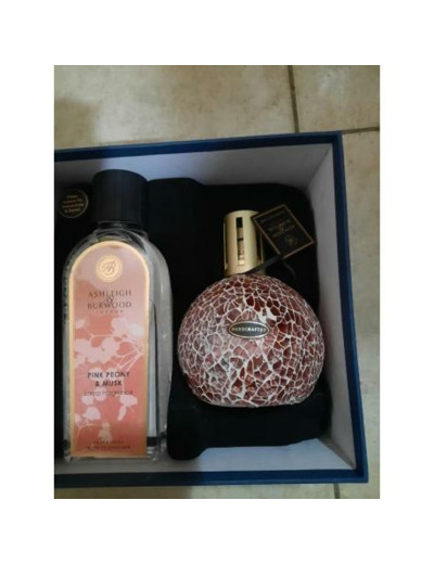 Coffret spécial fête des mères : Lampe à catalyse 16cmx10.5x11 en verre + flacon pivoines roses et Musk 250ml, délicate et décorative, cette lampe diffuse un délicieux parfum. Cette lampe purifie l'air de votre maison. Entonnoir fourni.