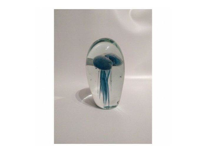 Objet de décoration, presse papier en verre représentant deux méduses. Amenez une touche poétique et marine avec cet animal des fonds marins, coloré de bleu turquoise.