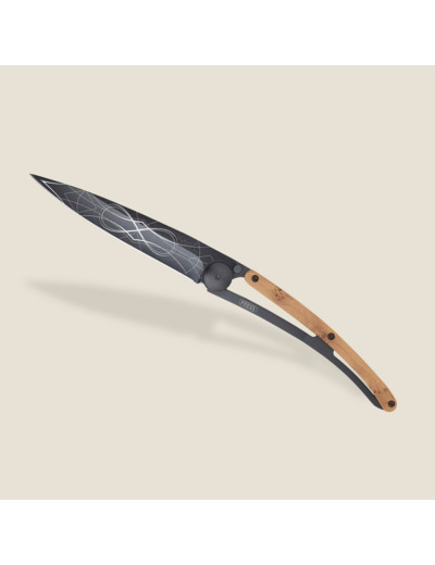 Couteau ultra léger en acier inoxydable Z40C13, finition titane noir. Lame avec cran de sécurité de type 'liner lock' décorée d'une fine gravure au laser. Clip de ceinture. Manche en Genévrier.