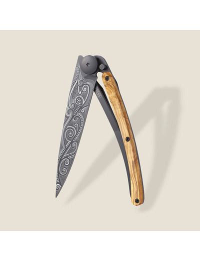 Déferlantes de l'océan ou souffles du vent ? Laissez votre imagination vagabonder au gré des arabesques gracieuses qui décorent la lame de ce Deejo majestueux orné d’une plaquette en bois d’olivier lumineuse.
