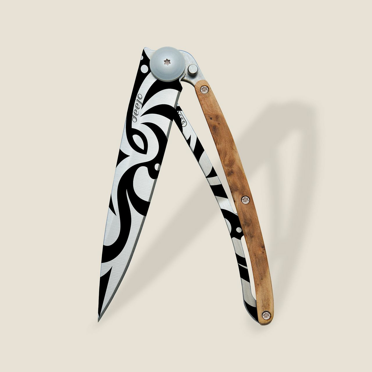 Couteau ultra léger en acier inoxydable Z40C13, finition titane gris. Lame avec cran de sécurité de type 'liner lock' décorée d'une fine gravure au laser. Clip de ceinture. Manche en Genévrier.
