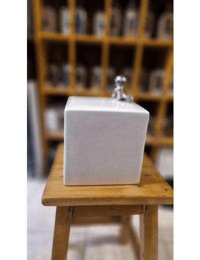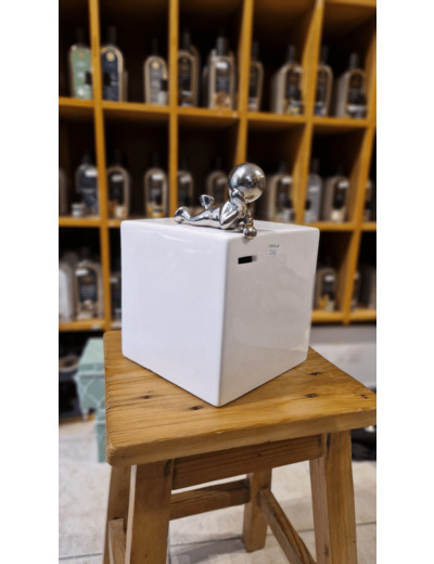 Tirelire en porcelaine blanche avec un petit bonhomme gris allongé sur la tirelire