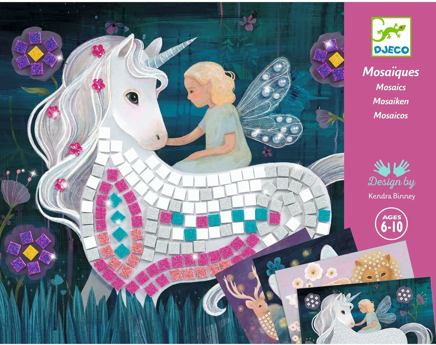Un coffret pour s’initier à l’art de la mosaïque. 4 tableaux à décorer en collant des petits carrés de mousse pailletée et des strass. L’enfant repère les numéros, puis colle les pièces correspondantes à l’emplacement désigné. Les tableaux se remplissent et le monde enchanté se pare de rayons chatoyants.