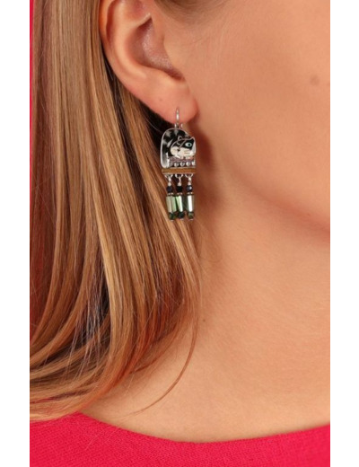 Couleur argent et noir, Métal, résines colorées dont les motifs sont peints à la main, perles en verre