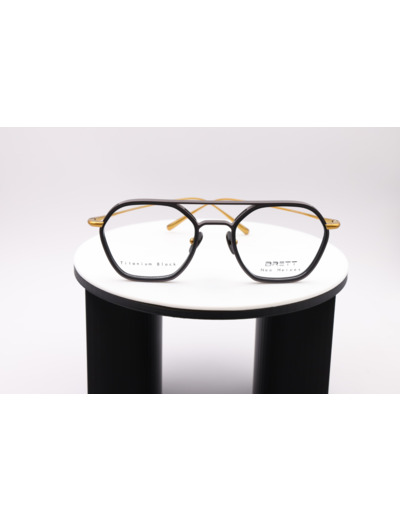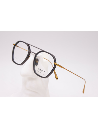 La monture PHIL dans son coloris C26 se distingue par un contraste saisissant : une face en noir mat subtilement structurée, combinée à des branches en doré satiné pour une touche de raffinement industriel. L’esthétique géométrique et la double barre caractéristique rappellent l’univers des pilotes et renforcent l’identité virile et affirmée de ce modèle. Fabriquée en titane haut de gamme, cette monture se veut aussi légère que robuste, fidèle à l’ADN technique de BRETT.