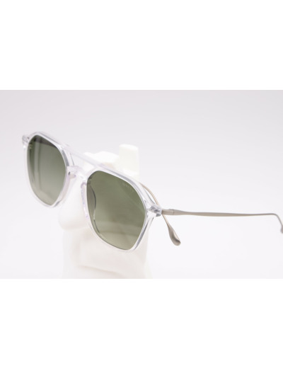 Le modèle VIC SUN en coloris C11 mise sur un design audacieux et minimaliste, avec une face en acétate cristal transparent ultra contemporain, associée à des branches en métal champagne brossé d’une grande finesse. Le double pont intégré renforce le caractère de la monture, tout en assurant une stabilité parfaite. Les verres solaires verts ajoutent une dimension rétro chic et protègent efficacement tout en affirmant un style résolument masculin et assumé.