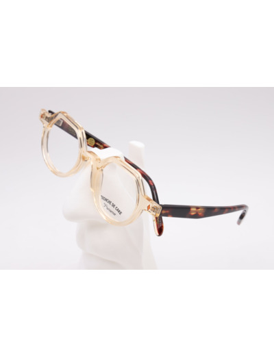 La Léon C9 arbore une silhouette géométrique audacieuse à la forme hexagonale adoucie. Sa face en acétate champagne translucide illumine le visage tout en conservant une allure moderne et raffinée. Les branches en écaille foncée apportent un contraste subtil qui ancre le design dans un équilibre parfait entre classique et contemporain. Un petit losange orangé sur les charnières signe la touche Tronche de cake.
