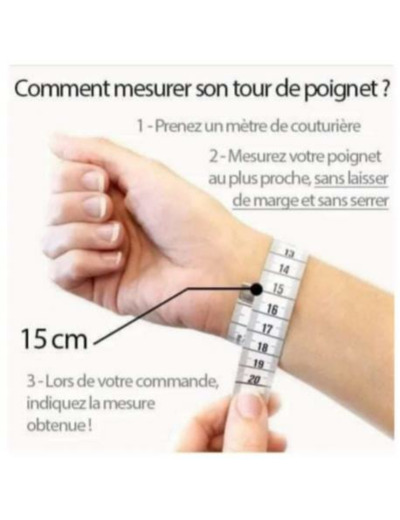 N'hésitez pas a mesurer votre poignet a l'aide de la photo, transmettez moi la mesure trouvée sans ajouter de centimètre.