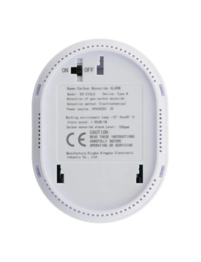 Détection par capteur électrochimique Fonctions : silence (hush) et alarme batterie faible Plage de température de fonctionnement : -10°C à +55°C Plage d'humidité de fonctionnement : < 93% sans condensation Alimentation : pile lithium intégrée, autonomie 10 ans Détecteur de monoxyde de carbone autonomie 10 ans - Otio Ce détecteur de CO déclenche une alarme puissante (> 85dB) pour avertir les occupants à évacuer les lieux en cas de détection de monoxyde de carbone. Son alerte progressive en fonction du niveau de concentration permet de réagir efficacement face au danger et de se mettre à l'abri de tout danger. Équipé d'une batterie longue durée de 10 ans d'autonomie, plus besoin de continuellement remplacer les piles. Elle couvre toute la durée de vie du produit. D'un montage simple et sans aucun raccordement électrique, il se fixe au mur. Il possède un signal de pile faible, un bouton test et de mise en silence ainsi que des voyants en façade qui indiquent son état de fonctionnement.