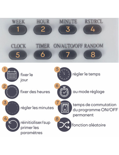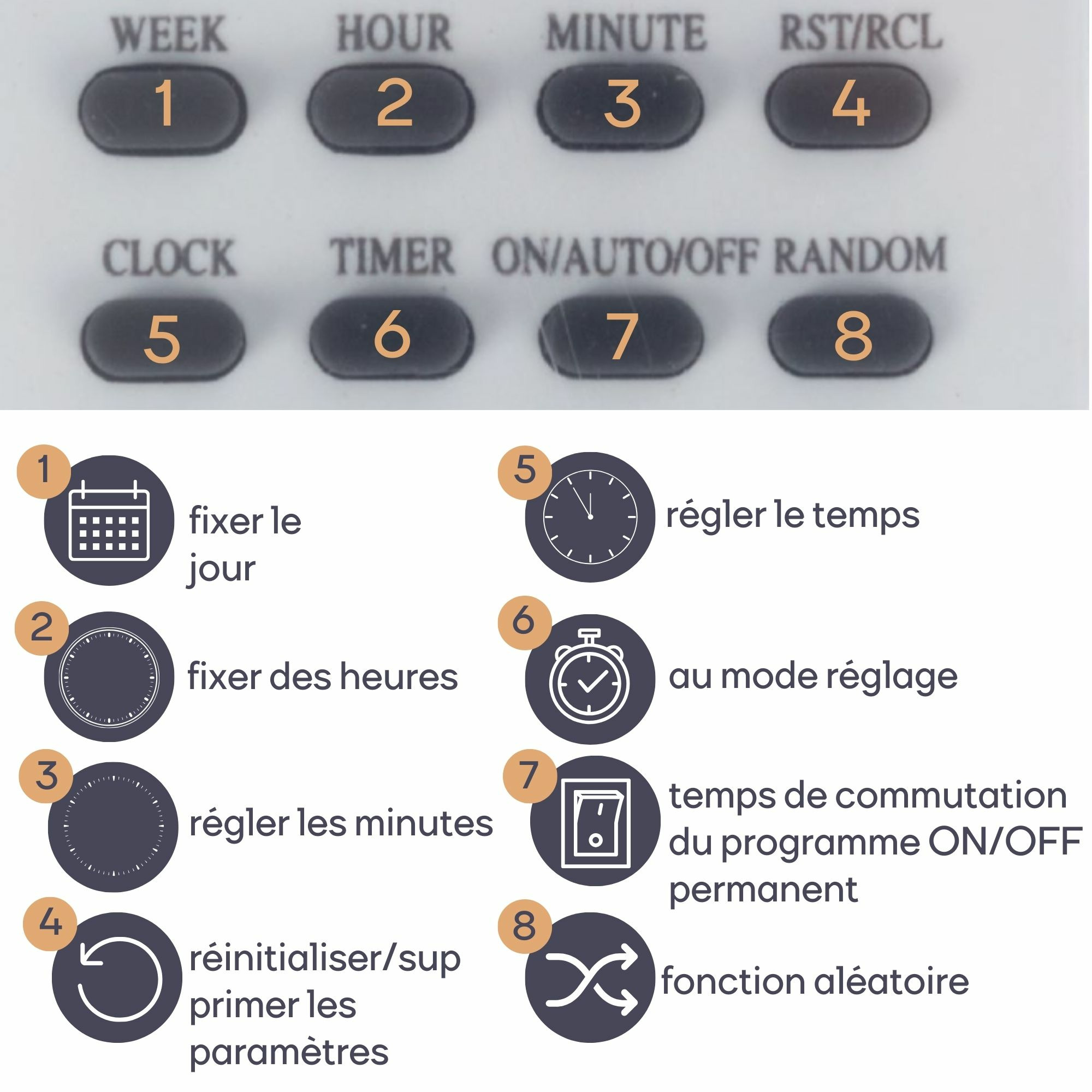 + Programmation précise: Ce minuteur offre jusqu'à 10 programmes marche/arrêt précis par semaine (1 min à 24H) afin que vous puissiez activer ou désactiver vos appareils à l'heure souhaitée.