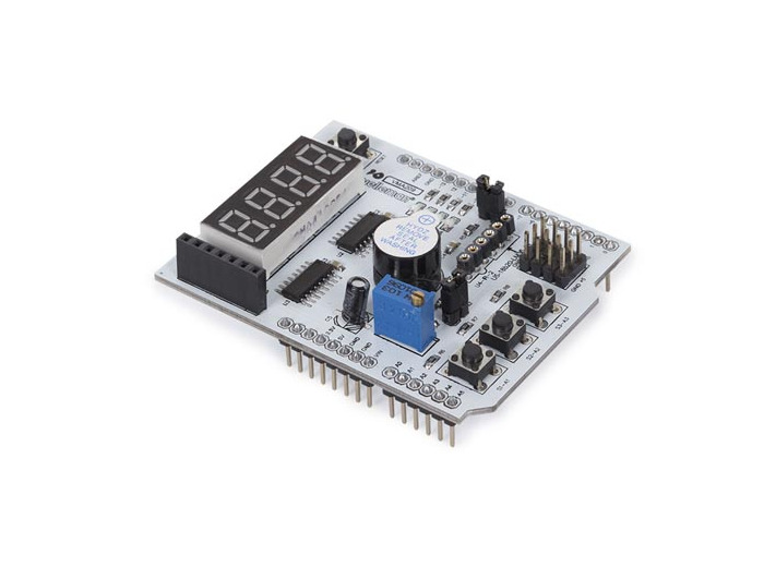 Découvrez la carte d'extension multifonction pour Arduino® : un accessoire puissant équipé d'un affichage 4 chiffres à 7 segments, de leds SMD lumineuses, de boutons-poussoirs et de différentes interfaces telles que DS18B20 et LM35. Parfait pour les débutants comme pour les passionnés de technologie expérimentés. La carte grise est compacte et légère, la rendant facile à intégrer dans n'importe quel projet. Ajoutez des fonctionnalités supplémentaires à votre expérience Arduino avec cette carte complète et facile à utiliser.