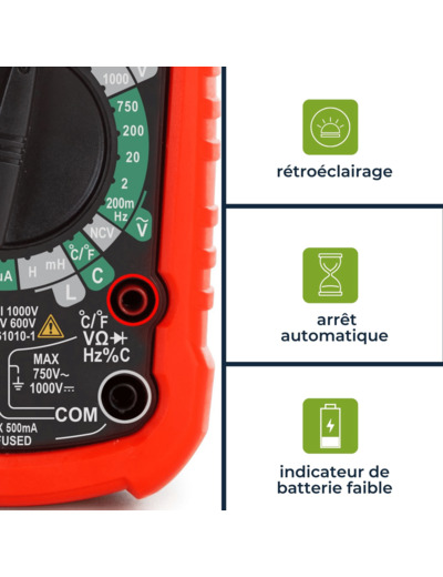 Ce multimètre numérique est l'outil idéal pour les électriciens et les installateurs professionnels. Grâce à sa conception compacte et robuste, vous pouvez l'emporter partout. Ce multimètre très complet permet de mesurer la tension, le courant et la résistance à l'aide des cordons de mesure fournis (100 cm). L'appareil est doté d'une fonction True RMS qui garantit des mesures précises de la tension et du courant. Mesure de température -- Grâce aux sondes de température fournies, vous pouvez facilement effectuer des tests de température précis dans une plage de mesure allant de -20 °C à 1000 °C. En outre, le mètre est doté d'une fonction REL et d'une fonction NCV. Il mètre dispose d'un écran rétroéclairé à 2000 points clairement lisible et d'une fonction torche pour des environnements mal éclairés. D'une catégorie de sécurité CAT III - 1000 V / CAT IV - 600 V et une mesure de courant de 10 mA et 10 A à 1000 V, vous pouvez être sûr d'une utilisation en toute sécurité.