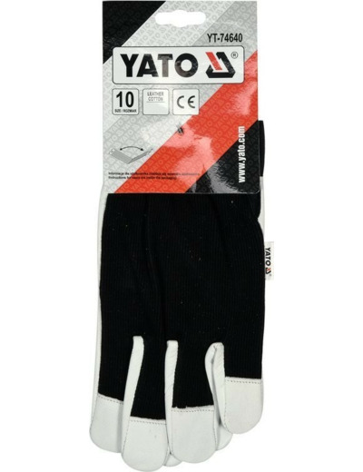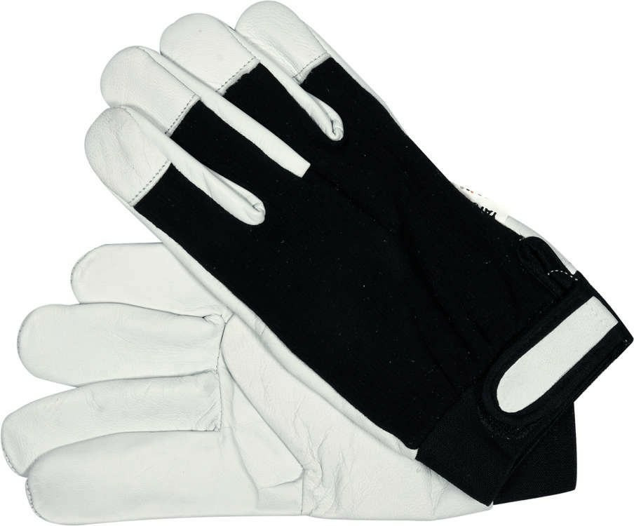 Gants de protection légers, 5 doigts. Devant en cuir souple / chèvre ou blanc de mouton / Tige en coton tricoté noir, manchette en caoutchouc avec fermeture velcro / Velcro