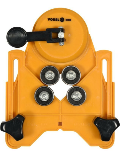 Un guide pour percer des carreaux de céramique ou d'autres matériaux. La gamme de diamètres de trous de Ø 4 mm à Ø 24 mm et après rotation du guide de Ø 25 à Ø 84 mm. La fixation du guide sur les carreaux avec une ventouse puissante sur la base permet un montage sur des plans horizontaux et verticaux. Le centrage du foret/mèche s'effectue entre les quatre paliers. Le corps de guidage est en plastique.